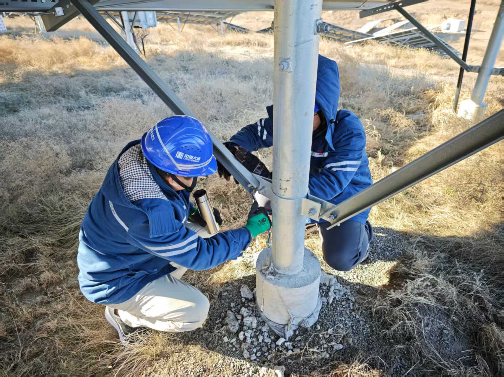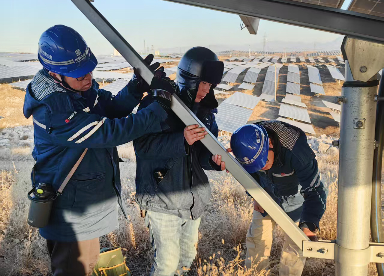 該公司人員對場區內設備支架、緊固螺栓、復壓壓塊等進行檢查,有效防止冬季大風天氣吹損光伏組件,為冬季設備安全穩定運行奠定安全基礎。