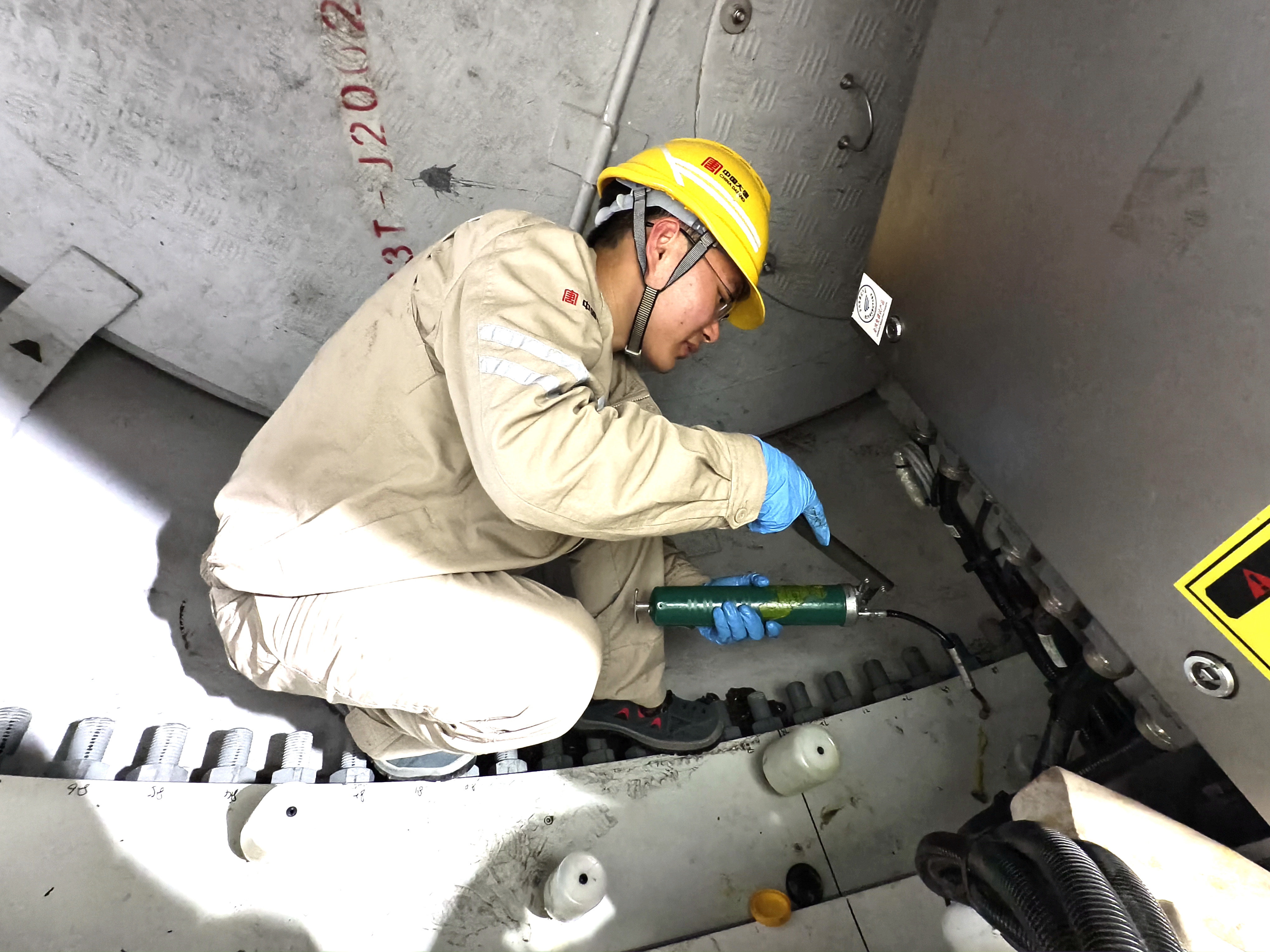 在這螺螄殼般的空間里,站直身體是奢望,彎腰弓背才是常態(tài)。每一次精準(zhǔn)的按壓,每一次黃油的注入,看似單調(diào)重復(fù),實則暗藏玄機與風(fēng)險。風(fēng)機半年定檢,考驗的不僅是指尖上的“繡花功夫”,更是鋼鐵般的意志與挑戰(zhàn)極限的勇氣。