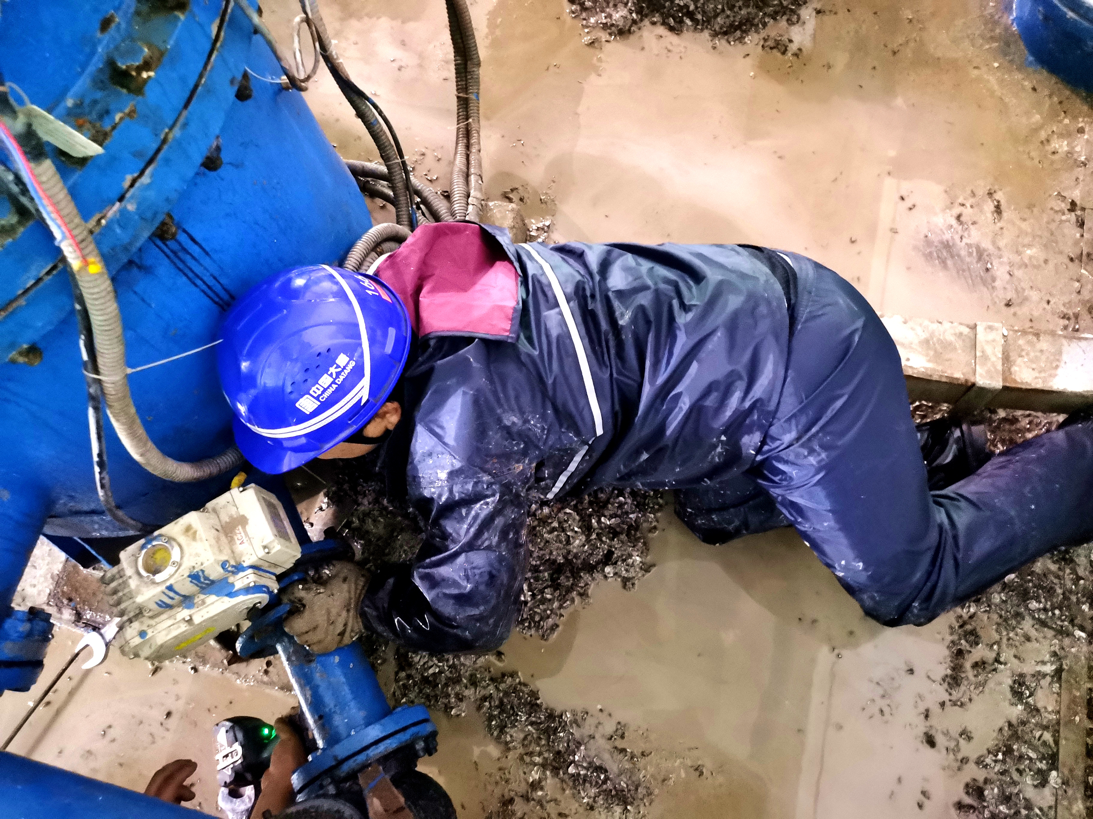 險情發(fā)生后,苗家壩水電站立即啟動應(yīng)急預(yù)案,迅速集結(jié)12名黨員、青年突擊隊隊員展開貝類堵塞緊急除險作業(yè)。