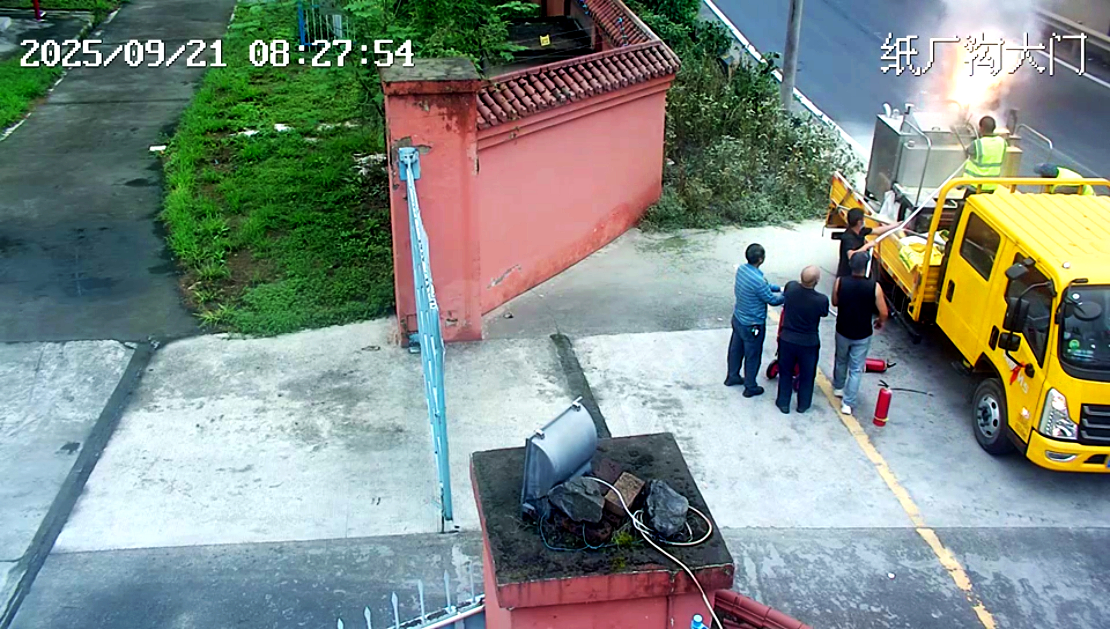 9月21日8點(diǎn)21分,該公司紙廠溝庫(kù)房大門前的馬路上,一輛正在執(zhí)行道路劃線作業(yè)的工程車突然燃起熊熊大火。火勢(shì)迅速擴(kuò)大,情況異常危急,車輛作業(yè)人員立即向距離最近的紙廠溝庫(kù)房值班人員發(fā)出求救信號(hào)。
