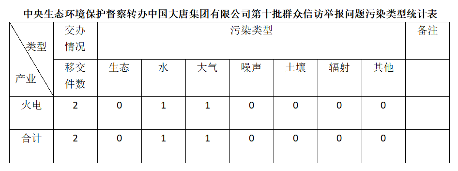2025年6月13日,中央第七生態(tài)環(huán)境保護督察組向中國大唐集團有限公司移交第十批群眾信訪舉報件,共計2件,均為來電舉報,涉及水問題1個、大氣問題1個。所有舉報件辦理工作已第一時間進入調查核實辦理程序,辦理情況將按照相關要求反饋督察組,并及時向社會公開。