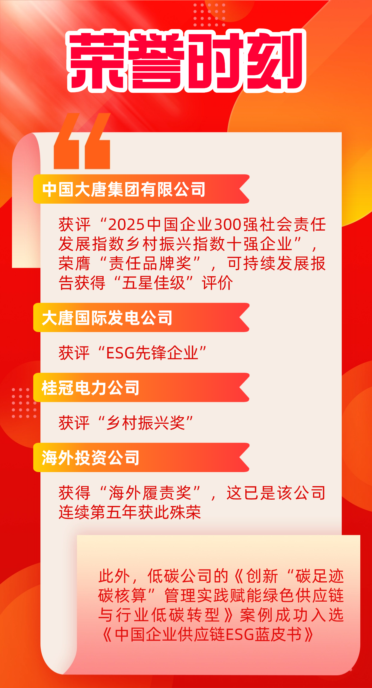 11月20日至21日,“錨定‘十五五’,履責新征程——ESG中國·第八屆北京責任展”在北京成功舉行?;顒悠陂g,正式發布《企業社會責任藍皮書(2025)》,舉辦“責任之夜——責任鯨牛獎”頒獎典禮,召開社會責任報告峰會會議。中國大唐斬獲六個獎項,一個優秀案例入選《中國企業供應鏈ESG藍皮書》。